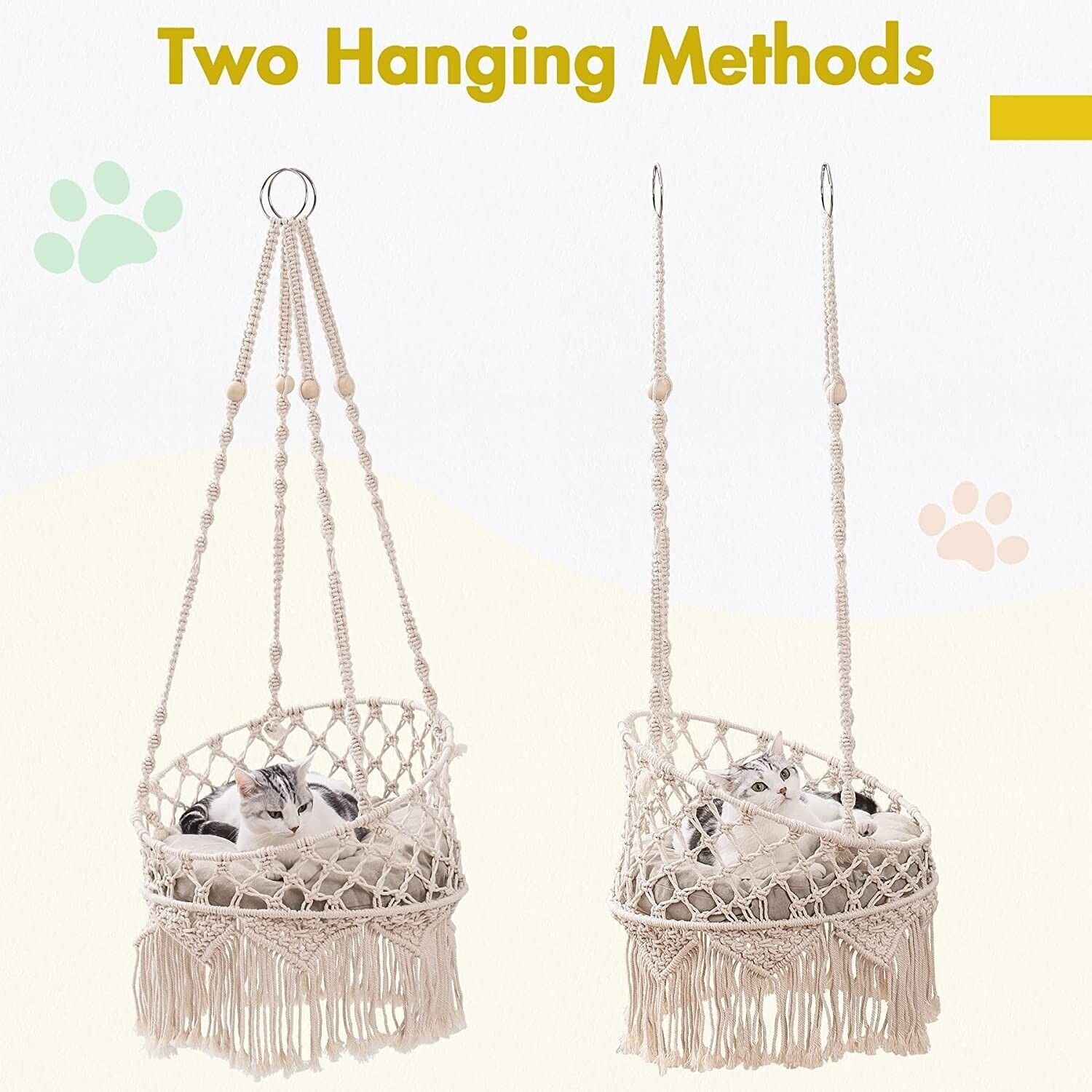 About this item[Sturdy & Durable ]: Boho macrame cat hammock bed is made of 100% natural high-quality cotton rope; the rope is thick and soft; with a long front and a short back; stable double steel hoop base ; making it easy for cats to jump in/out. Great for cats who like to curl up[Stable & Saves space]: The bottom of the hanging cat bed is supported by a metal frame; it can keep balance and reduce swing.Doesn’t take up any floor space which is great if you're tired of cat trees; cat houses and climbing posts taking over floor space in your place[Multi-location use]:The Boho macrame cat swing bed can become a lovely decor in your home plus a great snuggle place for your cat(s). you can hang it anywhere on the wall or in front of the window; or add it to your living room as a beautiful piece[Easy to hang and Assemble]: 2 ways to hang; hanging cat Hammock comes with everything you need to easily assemble. So it can be done quickly and easy to assemble[Suited for small; light weight cats]: Cat swing comes with a cotton pad; Size :42.1" L x 18.1" W.It can hold up to 18 lbs; Suitable for kitties or medium cat(s).